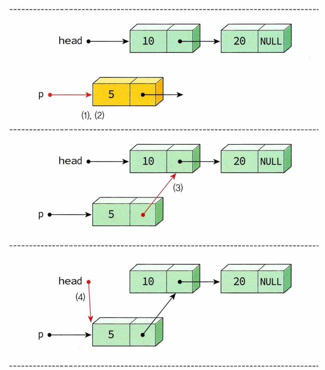 - insert_first() : head가 첫번째 노드 가리킴 > 리스트 시작 부분에 노드 추가하는 것 비교적 쉬움 ( 새로운 노드 하나 생성, 새로운 노드 링크에 현재 head값 저장 -> head 변경하여 새로 만든 노드 가리키게하기, insert_first() 는 변경된 헤드포인터 반환