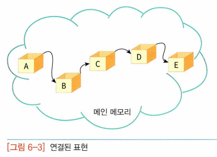 -> 데이터를 한 군데 모아두는 것 포기, 데이터들은 메인메모리상의 어디에나 흩어져서 존재. 이렇게 물리적으로 흩어져 있는 자료들을 서로 연결하여 하나로 묶는 방법: 연결리스트, 상자 연결 줄: 포인터
