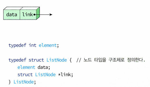 -> data필드는 element 타입 데이터 저장, link필드는 listNode 가리키는 포인터로 정의