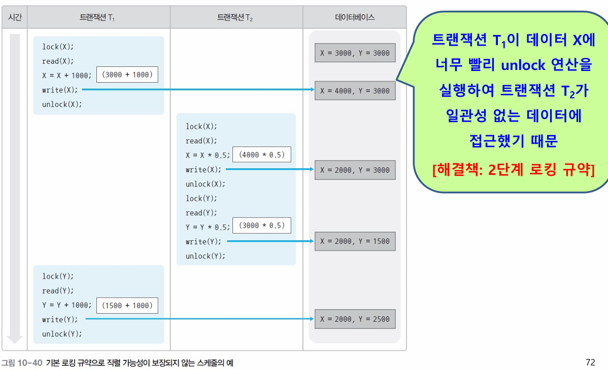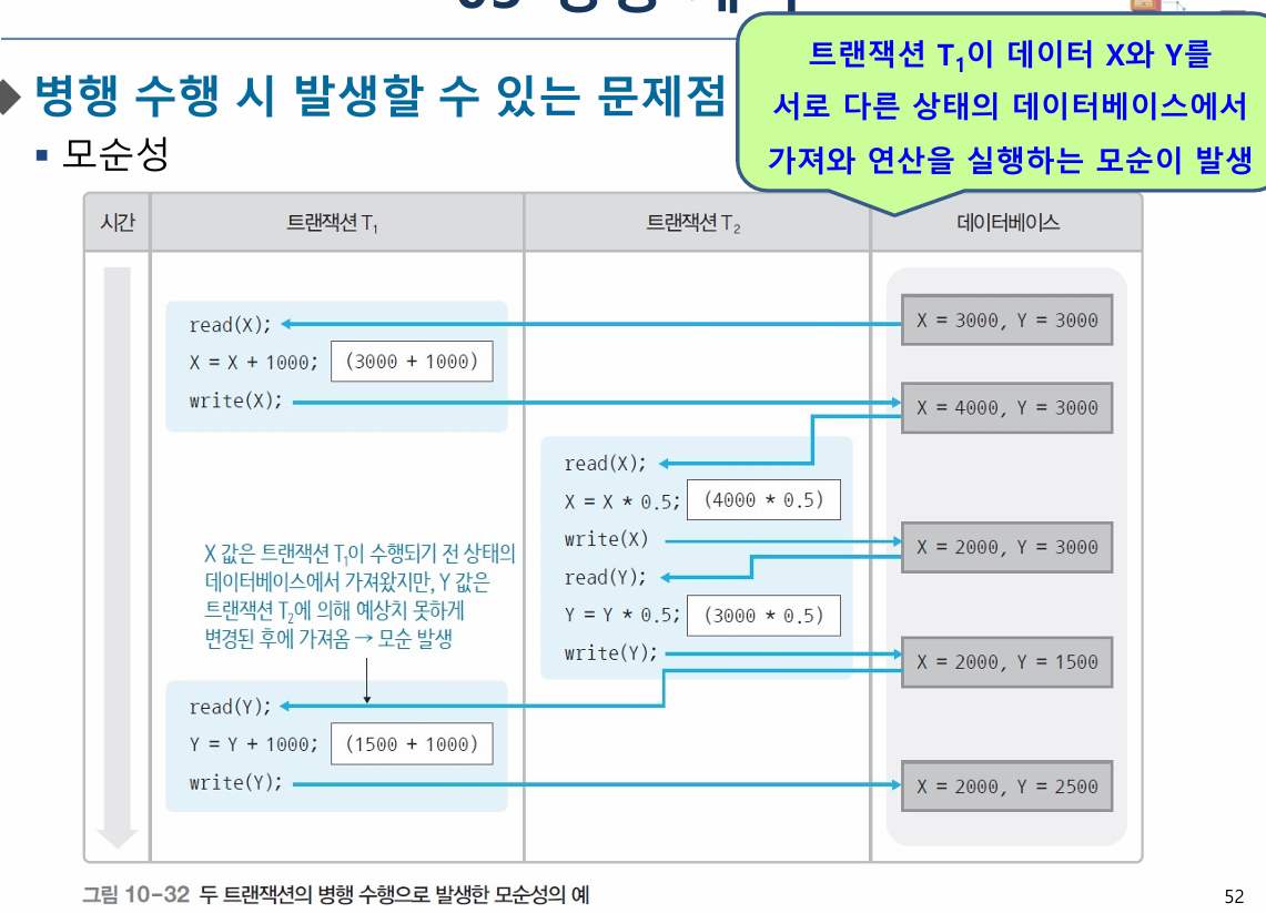 • 병행 수행 과정에서 갱신 분실, 모순성, 연쇄 복귀 등의 문제가 발생할 수 있어 결과의 정확성을 보장할 수 없음