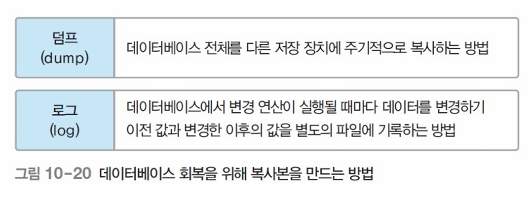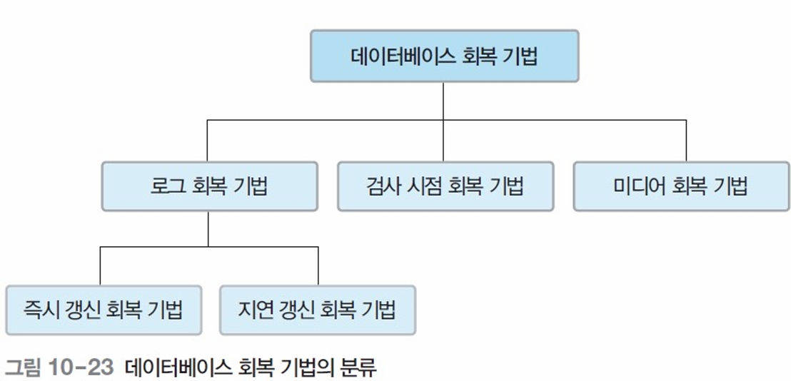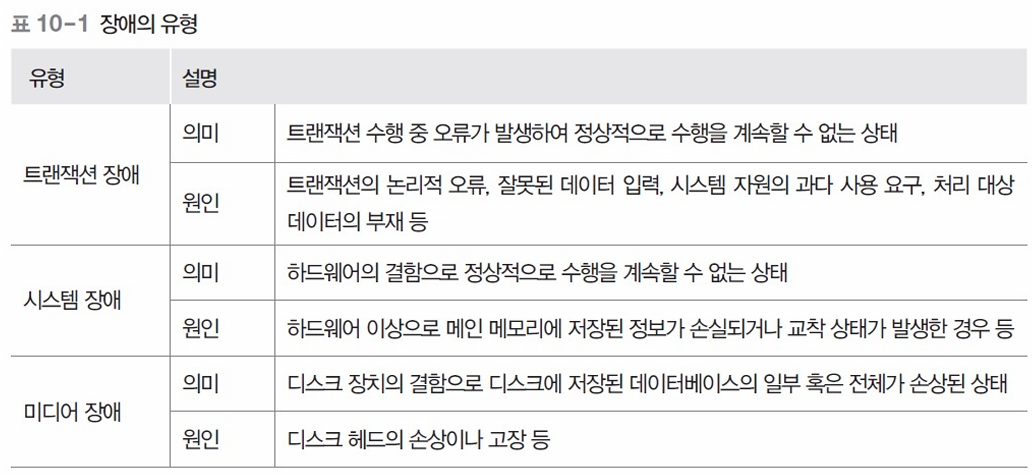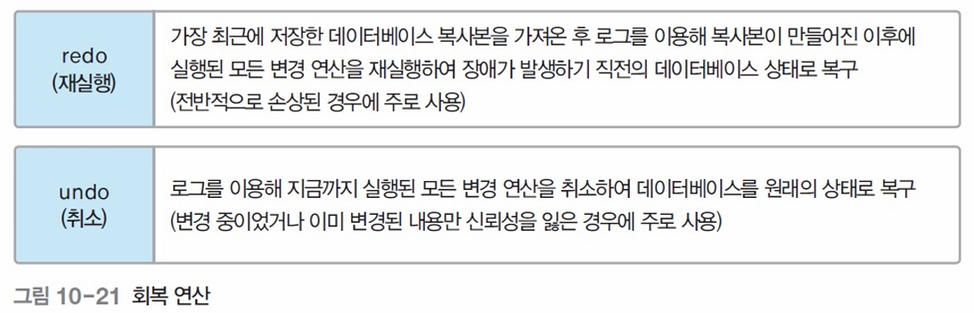 • 장애가 발생했을 때, 데이터베이스를 장애 발생 이전의 일관된 상태로 복구시키는 것