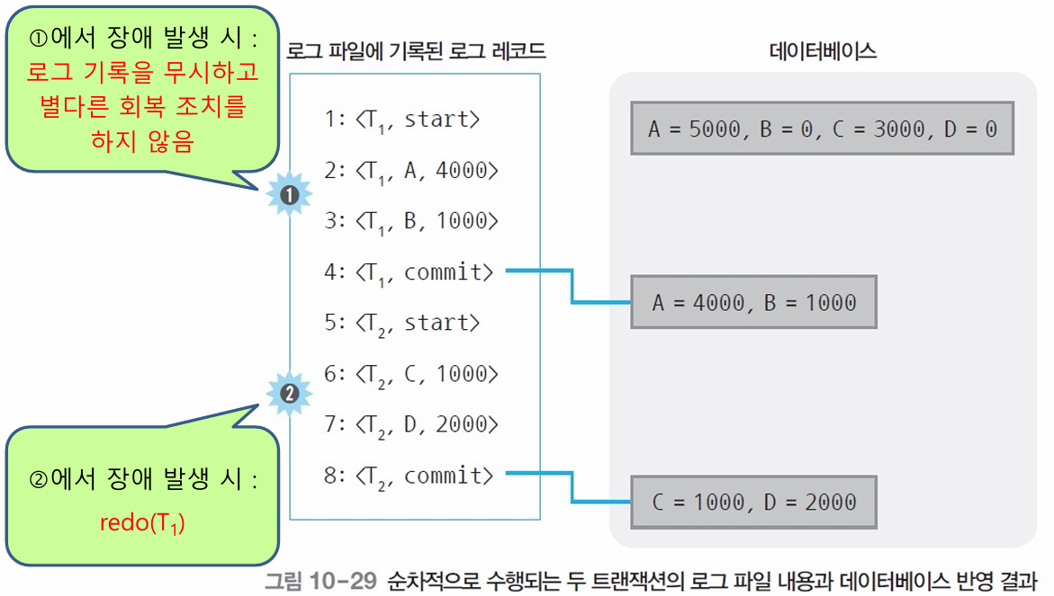 - <checkpoint L> 로그 레코드 기록 (L은 현재 실행 중인 트랜잭션 리스트)