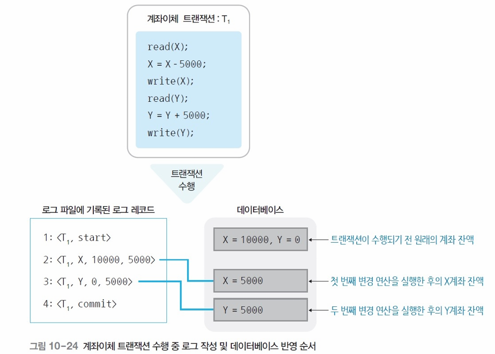 • 변경 연산이 실행되면, 먼저 로그 레코드를 기록한 후 데이터베이스에 변경 내용을 반영 - 복구 방식