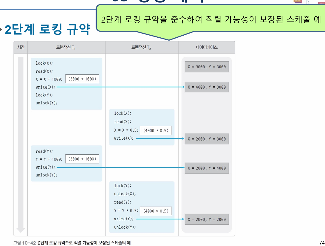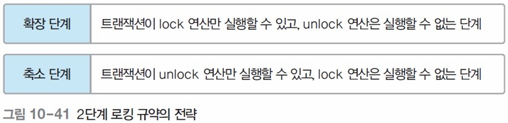 • 기본 로킹 규약의 문제점을 해결하고 **트랜잭션의 직렬 가능성(serializability)**을 보장하기 위해 lock과 unlock 연산의 수행 시점에 대한 규약을 추가한 방식 - 방법 (2단계 구조)