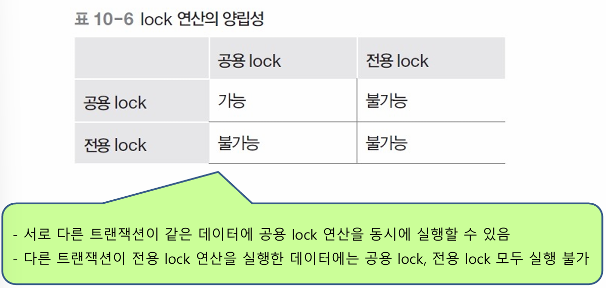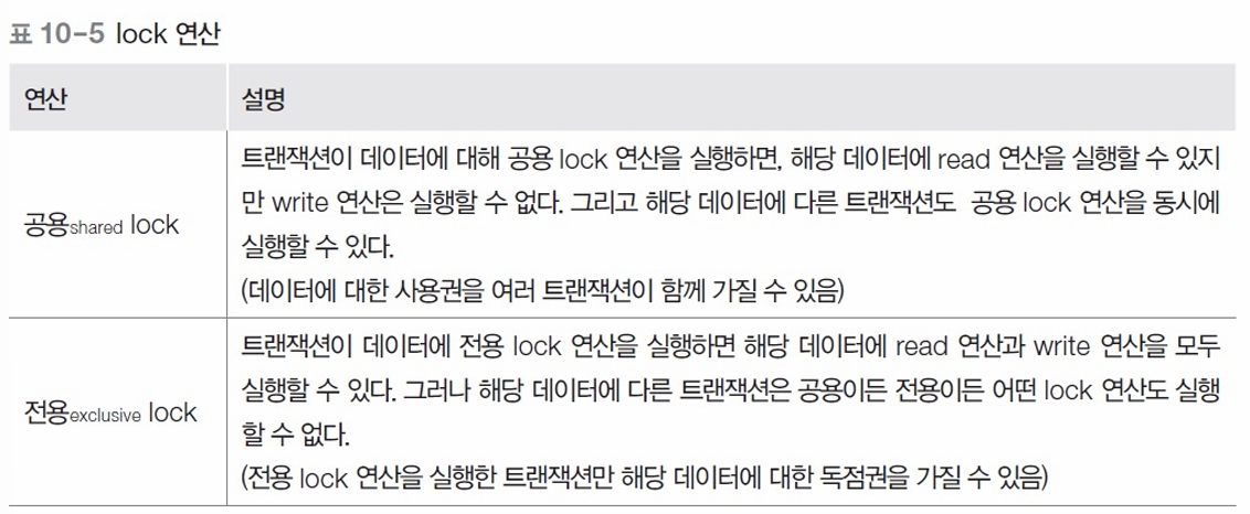 • lock: 트랜잭션이 데이터에 대한 독점권을 요청하는 연산