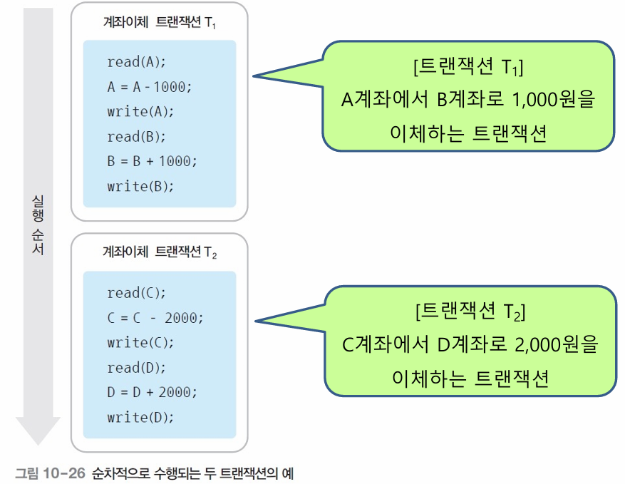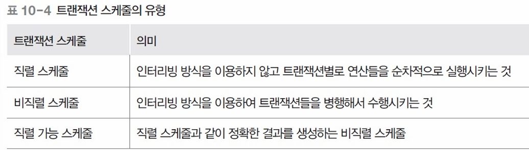 • 여러 트랜잭션이 차례로 번갈아 수행되는 인터리빙(interleaving) 방식으로 실행됨