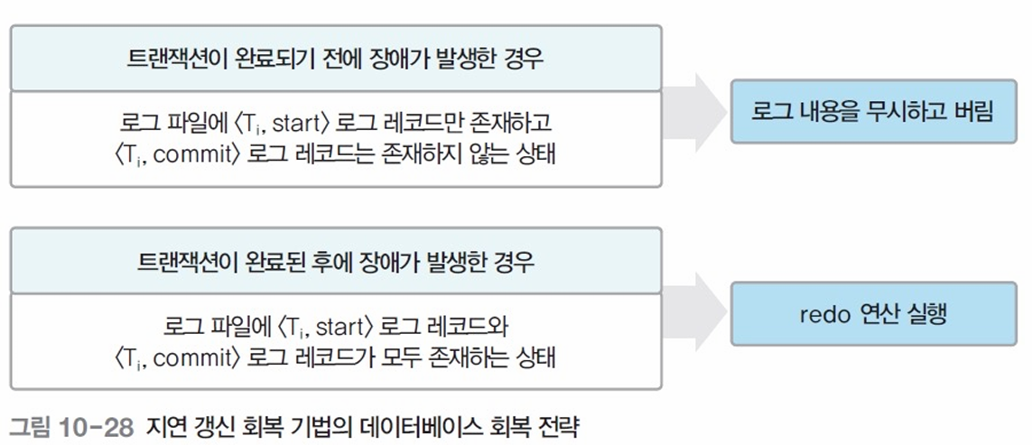 • 회복 작업은 즉시 갱신 또는 지연 갱신 기법을 이용해 수행 - 장점 (효율성 향상)