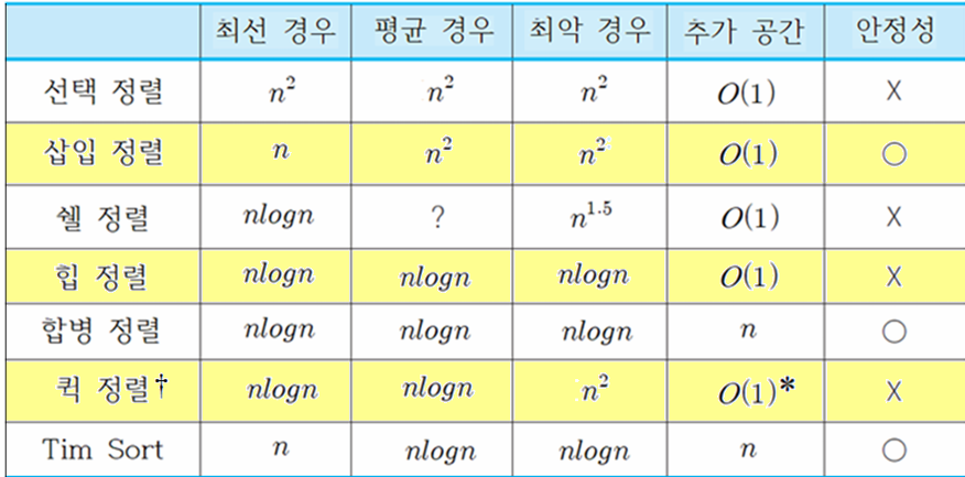 | 쉘 정렬 | O(nlogn) | ? | O(n^1.5) | O(1) | ❌ | gap 이용 삽입정렬 확장. 빠름 |
