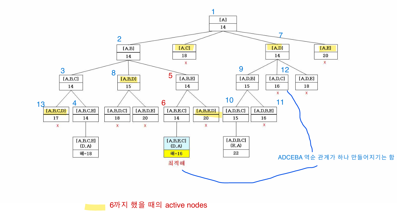 - 초기 상태 [A] → 모든 점의 최소 간선 2개 합 ÷ 2 = 초기 bound