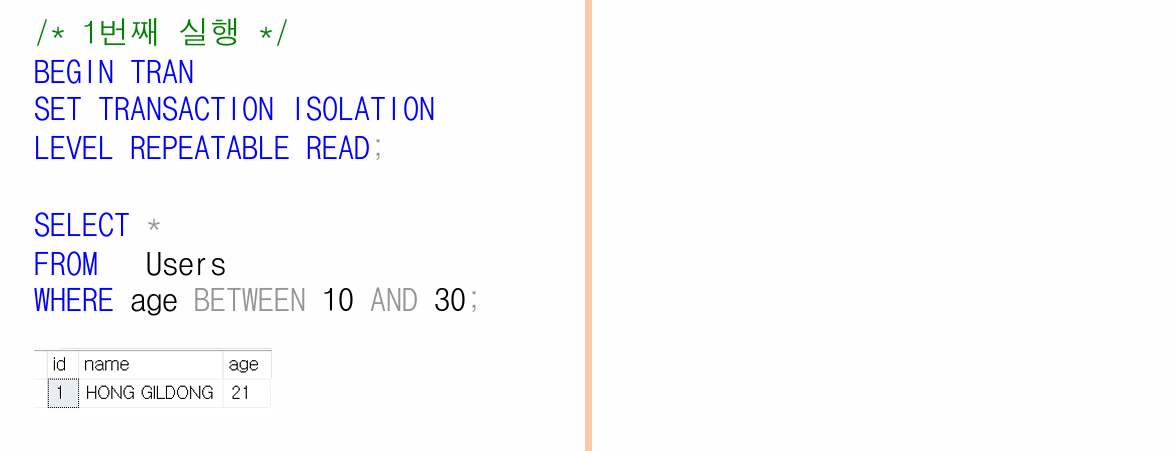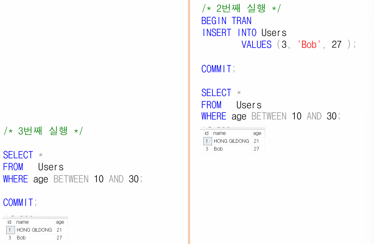 - Phantom Read: WHERE 조건에 새 행이 생겨 SELECT 결과에 추가됨