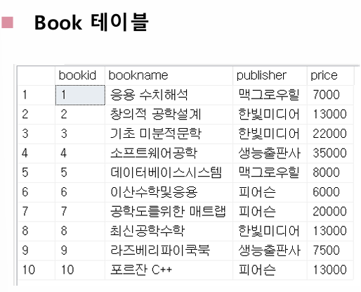 INSERT INTO Book VALUES(99, '데이터베이스', '한빛', 25000);