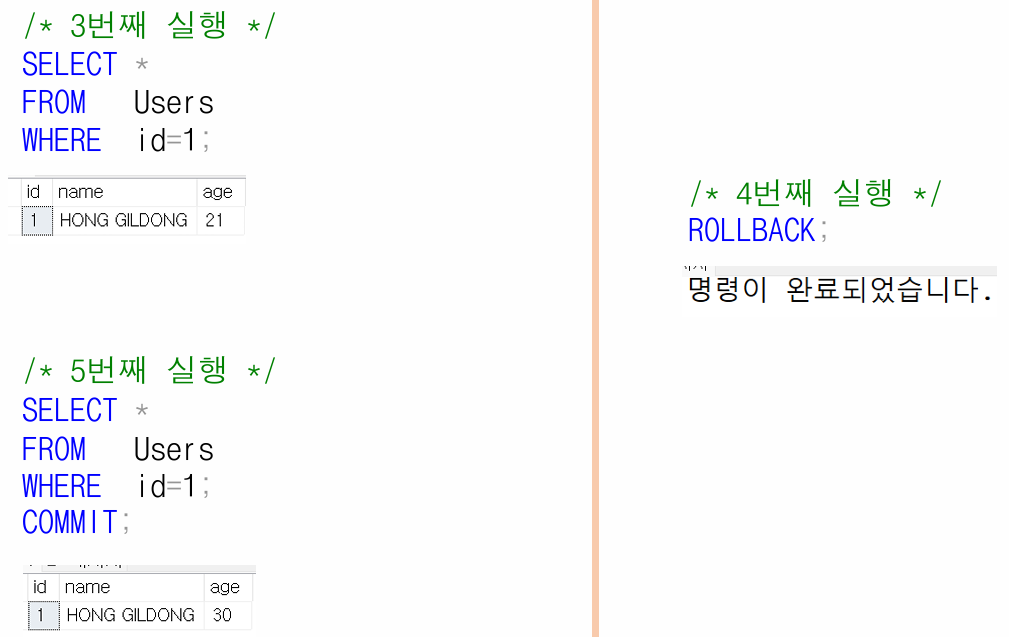 * 롤백은 지금까지 했던 데이터 변경 작업을 전부 취소하고, 처음 상태로 되돌리는 명령