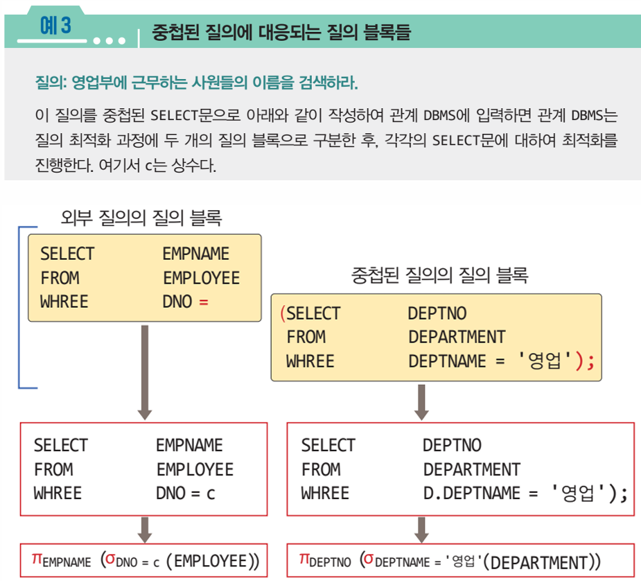 - 관계 DBMS는 사용자가 입력한 SELECT문을 관계대수식으로 변환