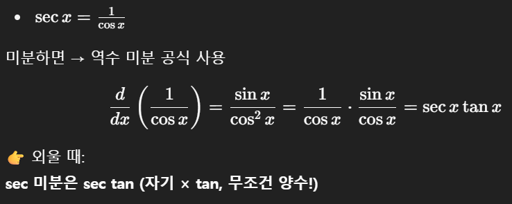 | sec x | 1 / cos x | cos x 즉 cos x의 역수! |
