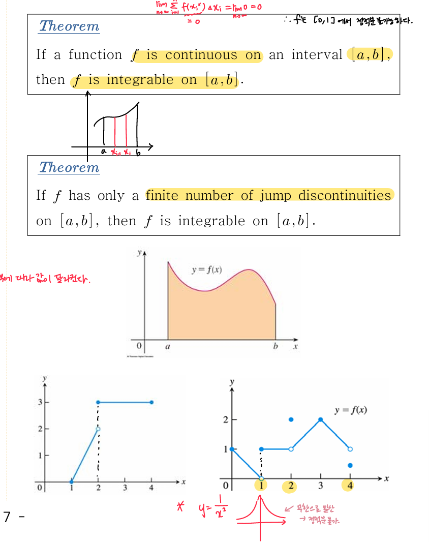 “유한 개의 jump discontinuities(도약 불연속점)”일 때 함수가 정적분 가능하다는 정리
