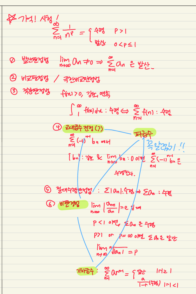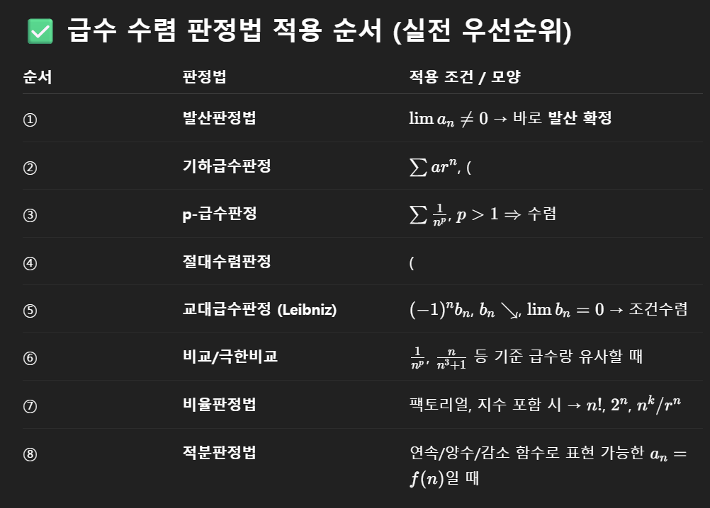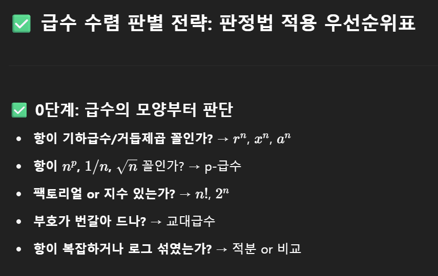 4. 교대 부호냐? → 교대급수판정 or 절대수렴 체크