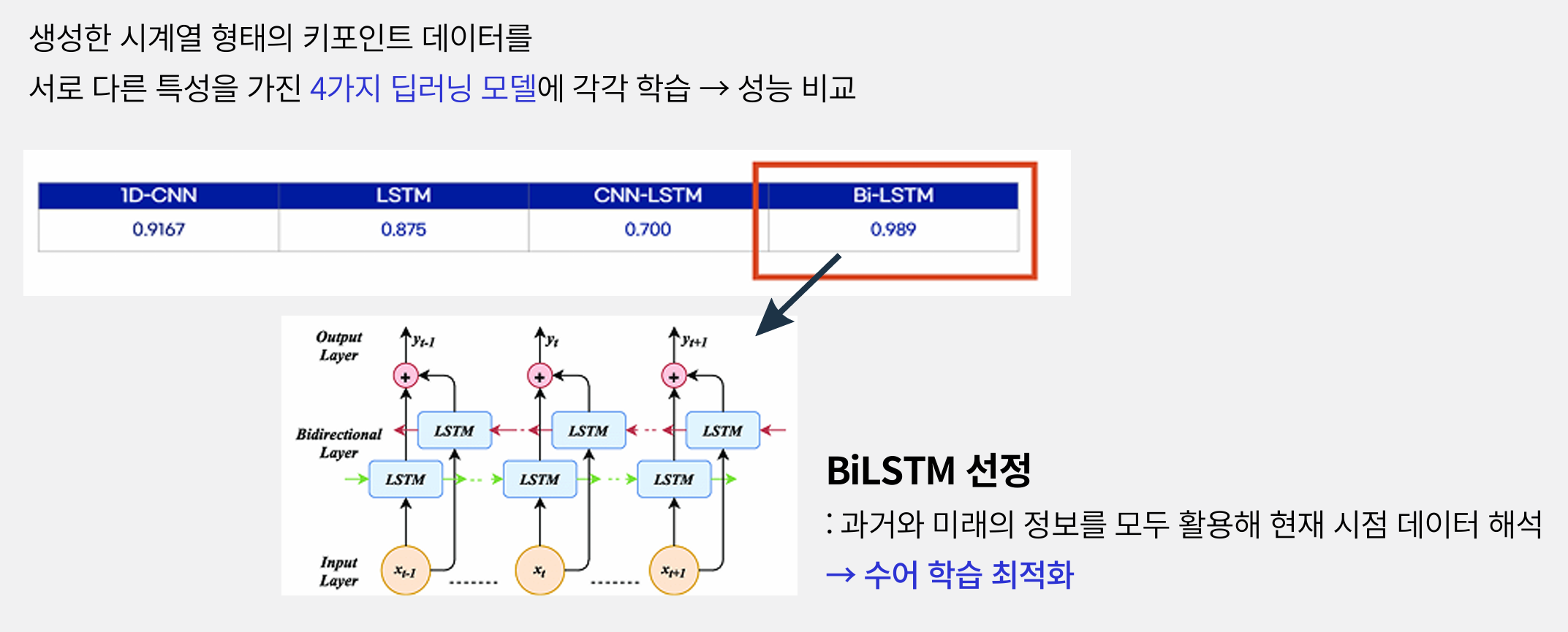 handDoc 서비스에서는 수어를 사용하는 청각장애인 환자가 자신의 수어를 실시간 텍스트로 변환해 의사에게 전달할 수 있도록 수어 인식 모델을 구축했다. Google MediaPipe Holistic으로 상반신 keypoint를 추출하고, 이를 기반으로 1D-CNN / LSTM / CNN+LSTM / BiLSTM 네 가지 모델을 각각 학습했다. 그중 Validation Accuracy 98.9%를 기록한 BiLSTM을 최종 모델로 선정했다.
