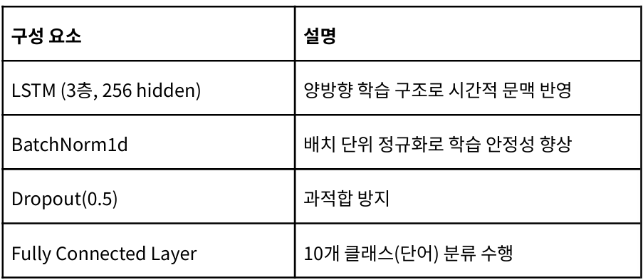 | 1D-CNN | 91.67% | 프레임 단위 특징 추출, 시계열 정보 약함 |