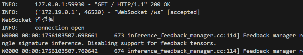 또한 실제 Docker 로그에서도 모델 로딩 직후 바로 OK로 바뀌는 걸 확인했다.