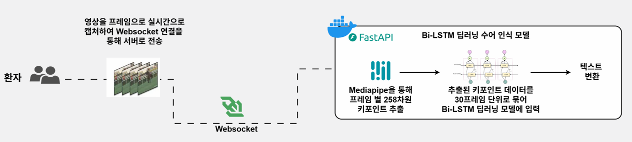 딥러닝 기반 Bi-LSTM 수어 인식 모델에 넣어 단어를 예측한다. - 예측된 단어를 텍스트로 변환해 의사 화면에 출력