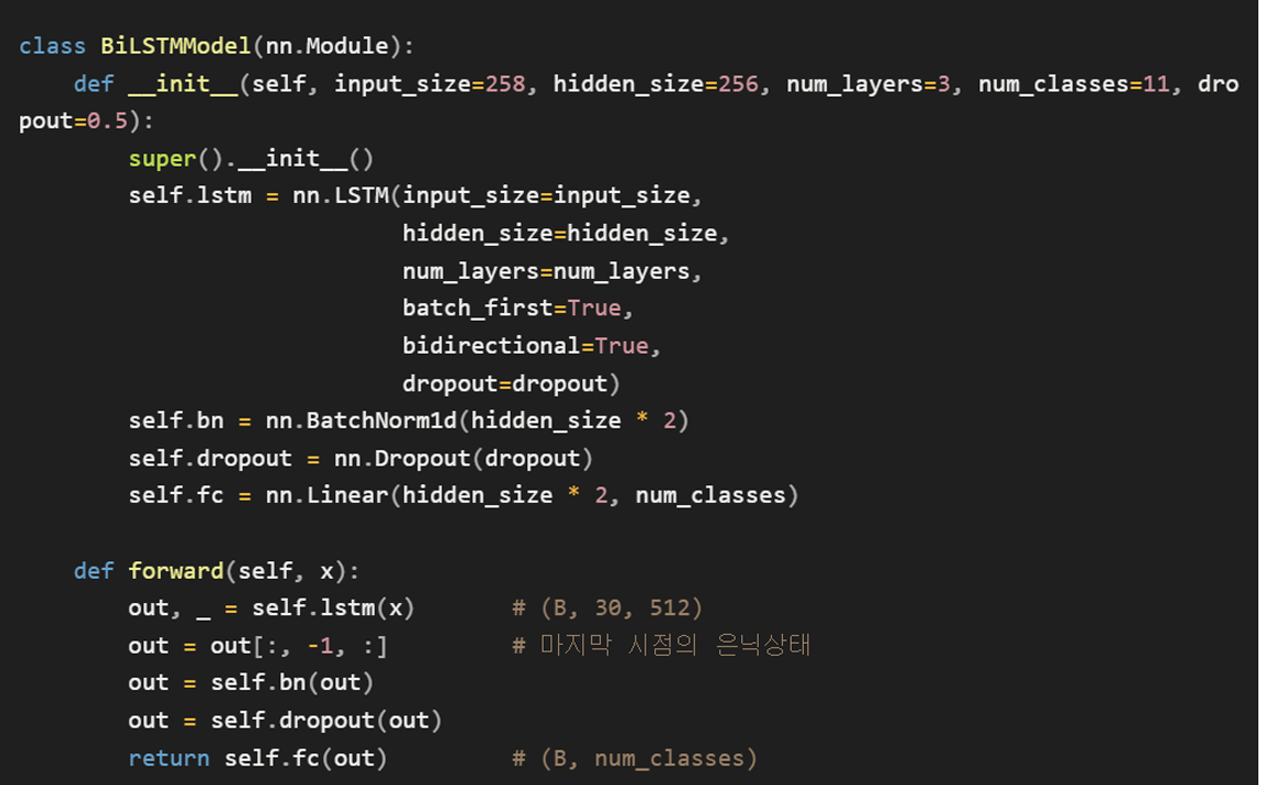즉, (30, 258) 시퀀스를 3층 양방향 LSTM으로 인코딩하고, 마지막 프레임의 은닉 벡터(512차원)를 기반으로 11개 단어 중 하나를 분류하는 구조이다.