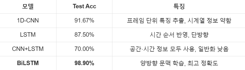 4가지 모델 중, 양방향 시퀀스를 모두 활용하여 현재시점 데이터를 해석하는 모델인 Bi-LSTM이 시계열적 데이터인 수어를 효과적으로 학습해, 가장 높은 정확도인 98.9%를 보였다.