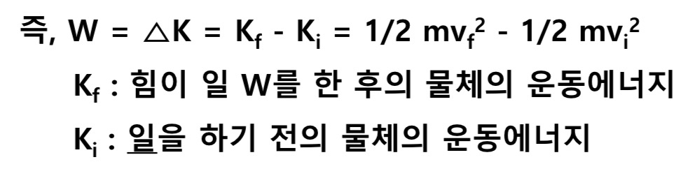 - 물체의 운동에너지 변화 = 물체에 작용하는 힘이 한 일