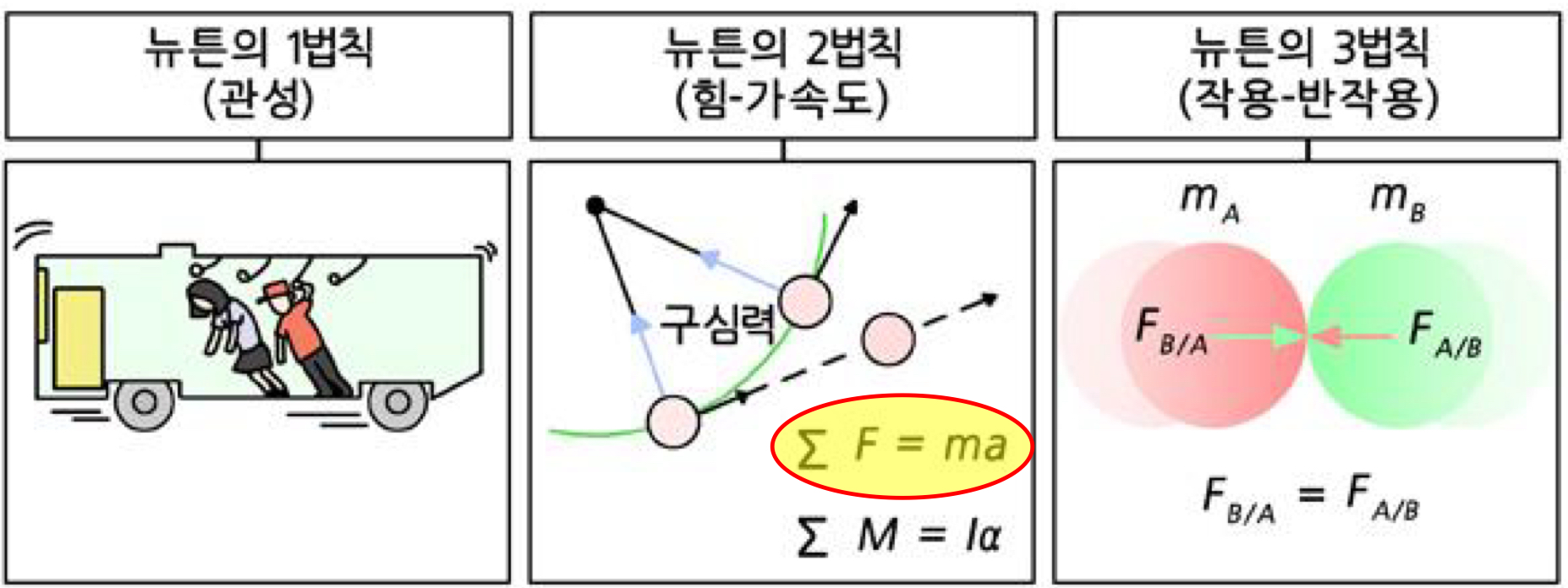 - 3법칙(작용-반작용의 법칙): 선운동량, 물체계, 질량중심 - 물체 A가 다른 물체 B에 힘을 가하면 물체 B는 물체 A에 크기는 같고 방향은 반대인 힘을 동시에 가함.
