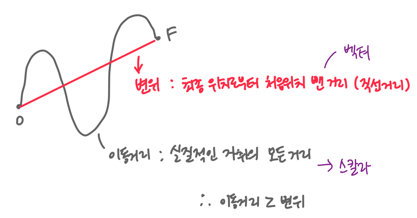 - 스칼라: magnitude(규모),크기가 있음, 점 only ex.질량, 시간, 온도, 전압, 전하,속력, 부피(m^3)