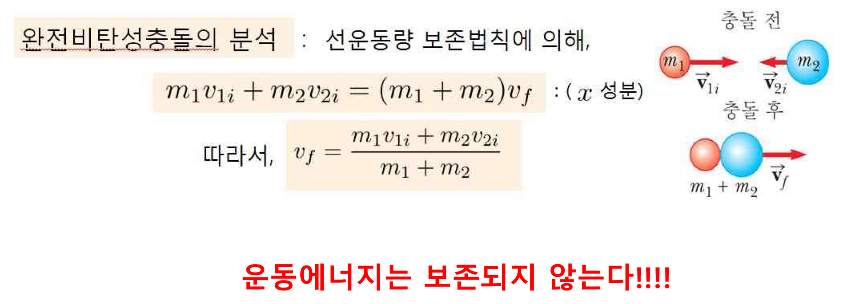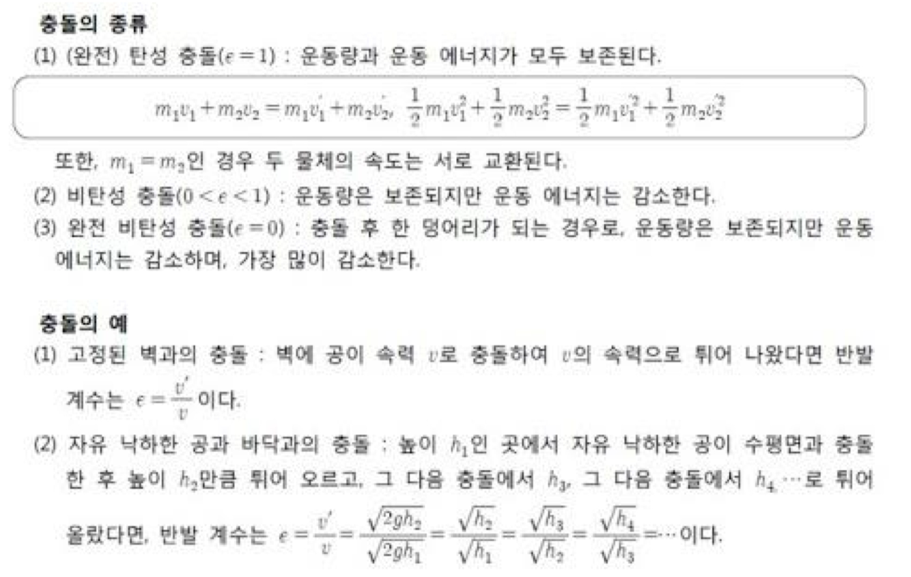 - 충돌 : 두 물체 사이 상호작용을 고려하지 않고 운동E만 고려한다. 어떤 경우에도 운동량이 보존된다.