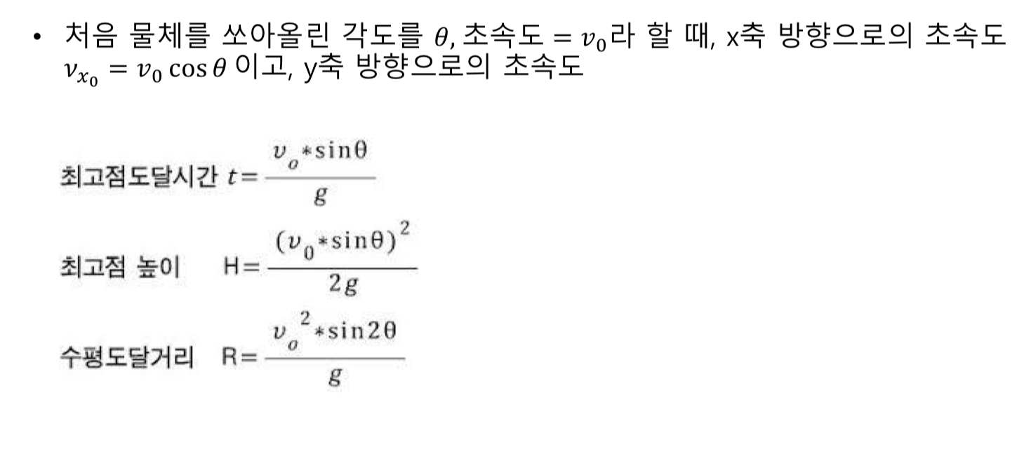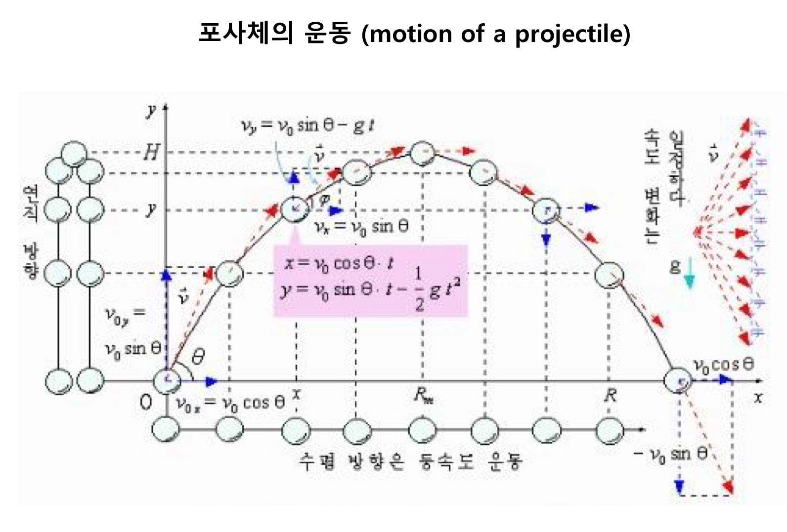- 포물선 운동 or 포물체/포사체 운동 : 두 성분(등속운동:수평, 등가속도운동: 수직) 이 합해져 방향이 변하는 운동