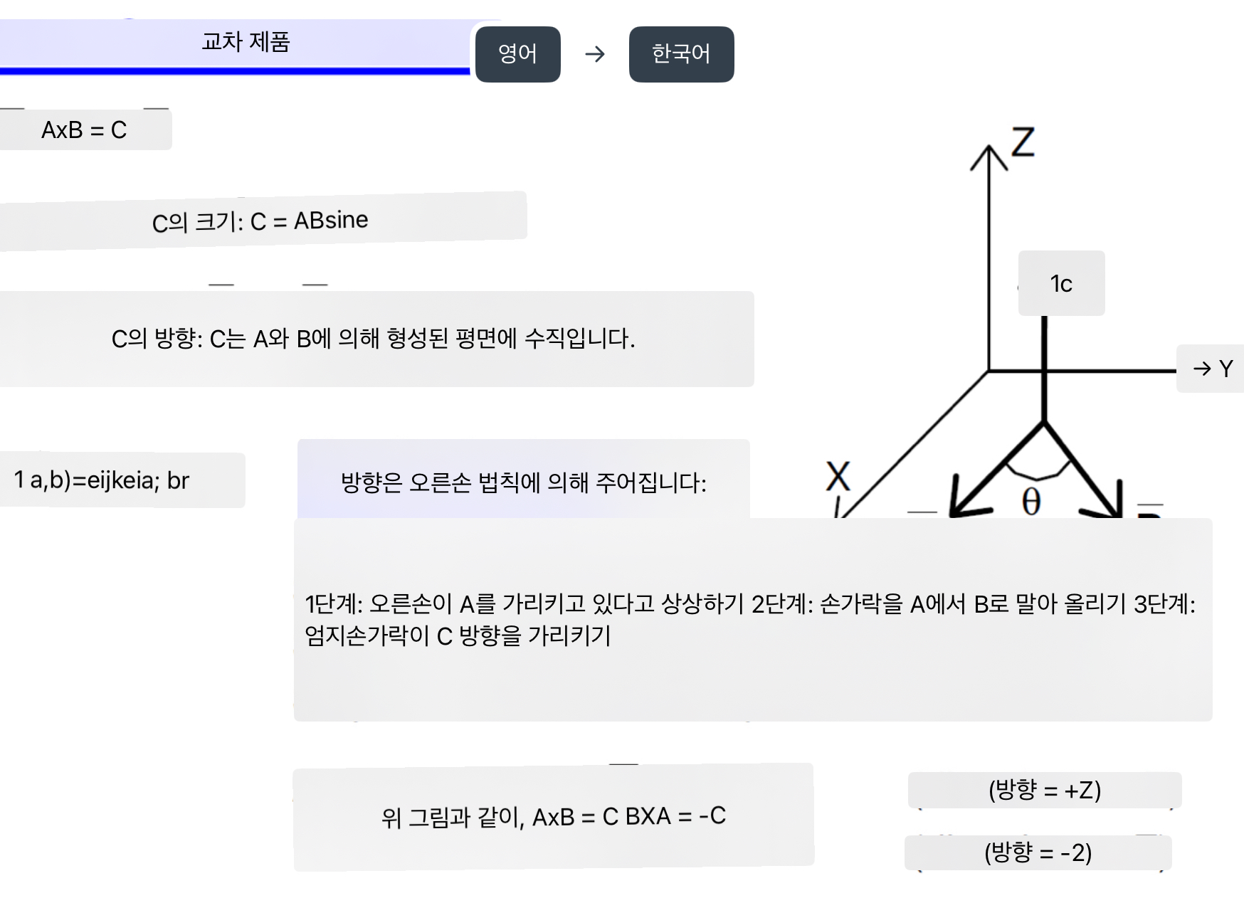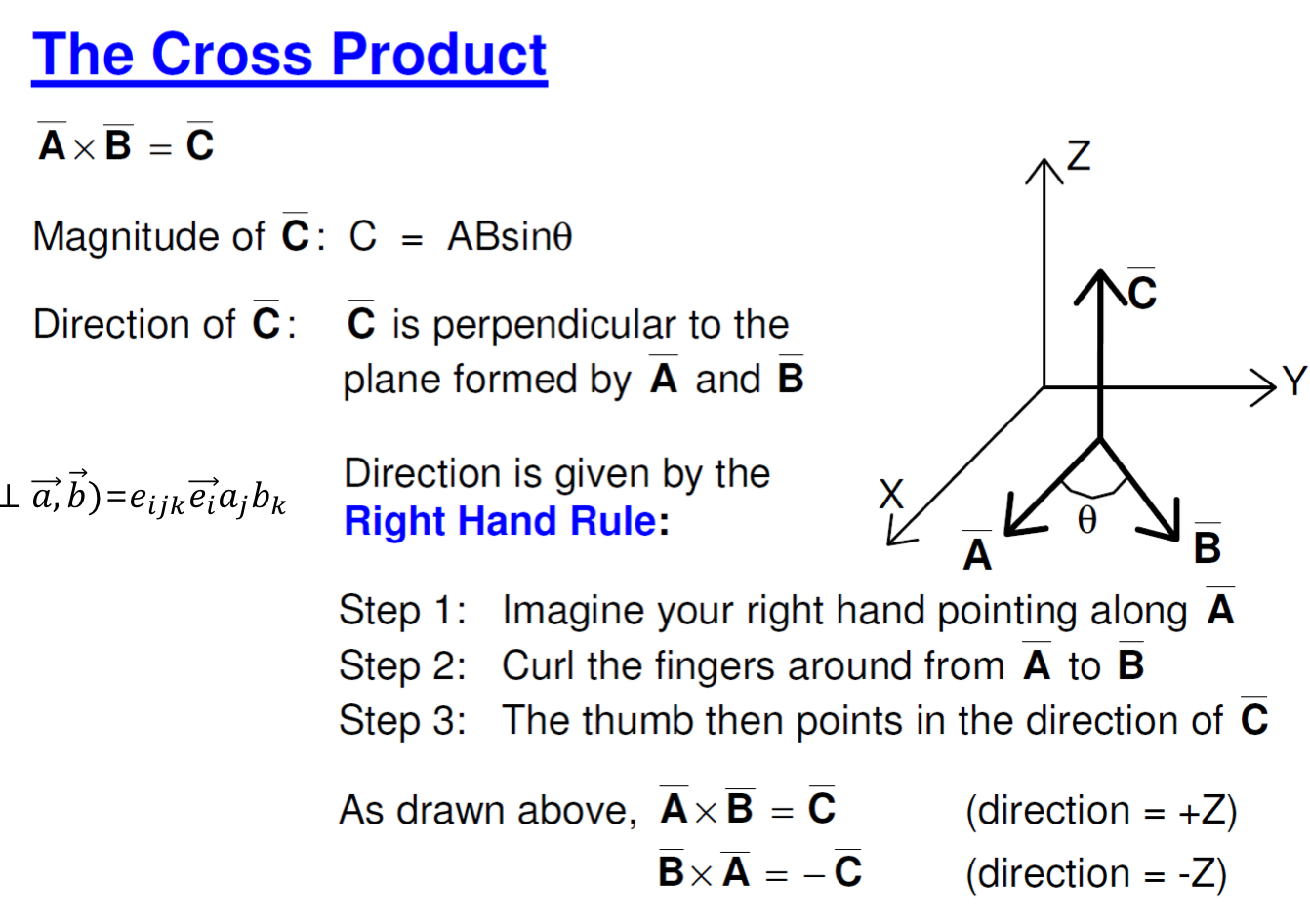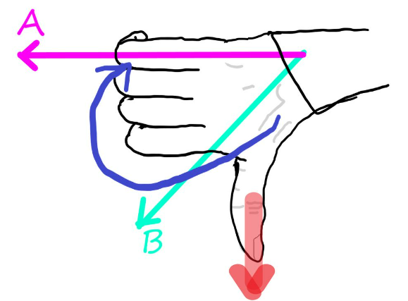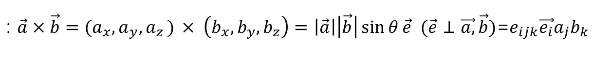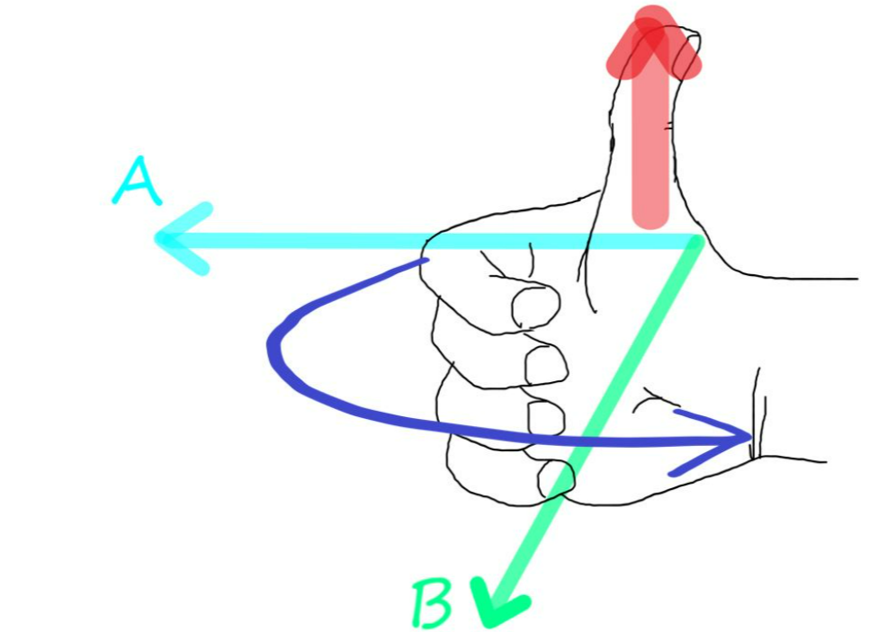 - 오른손법칙: A*B의 결과인 외적벡터는 벡터 A를 향해 손을 뻗은 후 벡터 B쪽으로 오므려줄 때 오른손의 엄지손가락이 가리키는 방향. 그 벡터는 두 벡터 A,B에 동시에 수직!