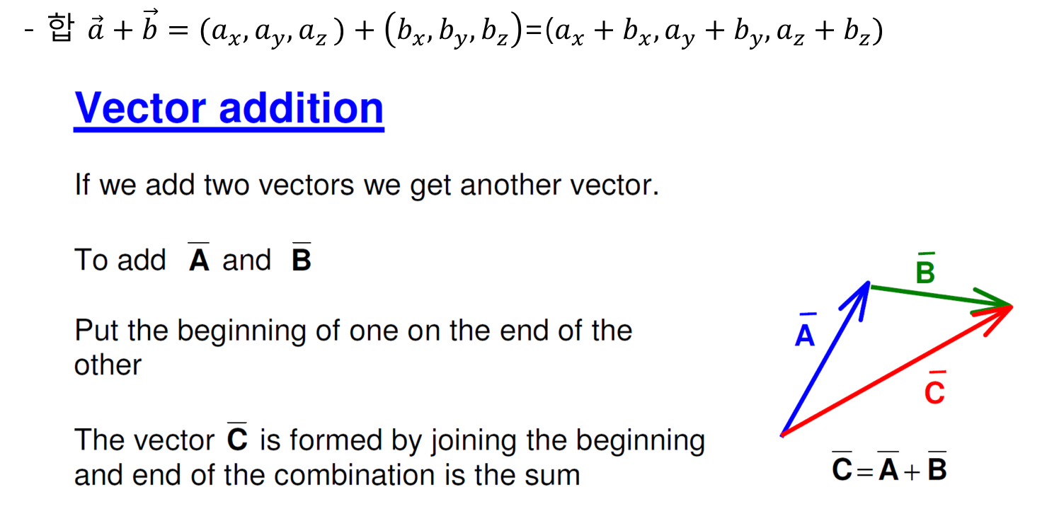 - 스칼라: magnitude(규모),크기가 있음, 점 only ex.질량, 시간, 온도, 전압, 전하,속력, 부피(m^3)