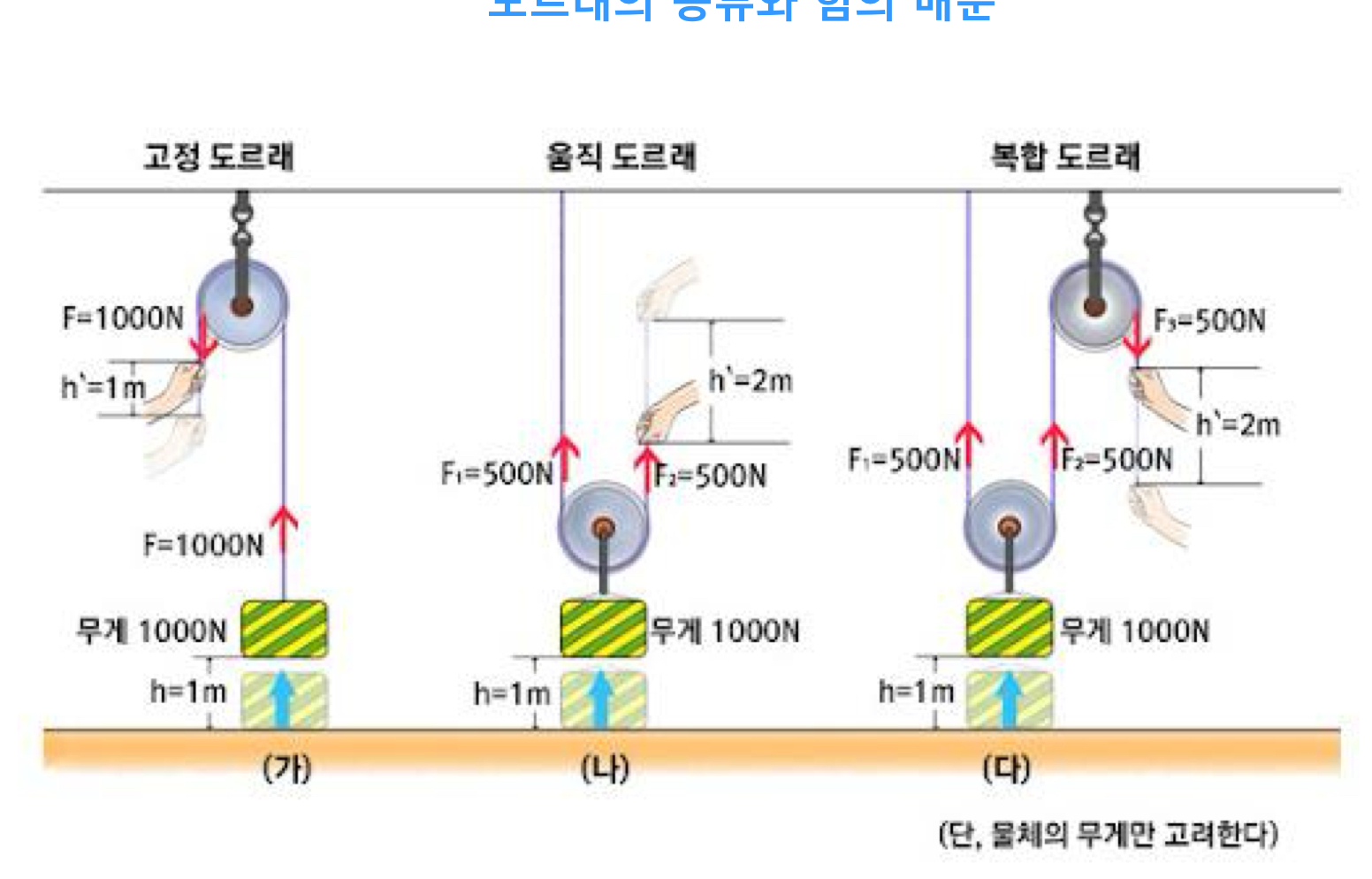 (가),(나)는 각 도르래에 걸리는 힘이 무게의 (1/2)^n(움직도르래 개수)로 감소하지만 (다),(라)는 물체를 지탱하는 전체 줄의 수만큼 힘이 줄어듦. (다)>(마) 변형 가능.