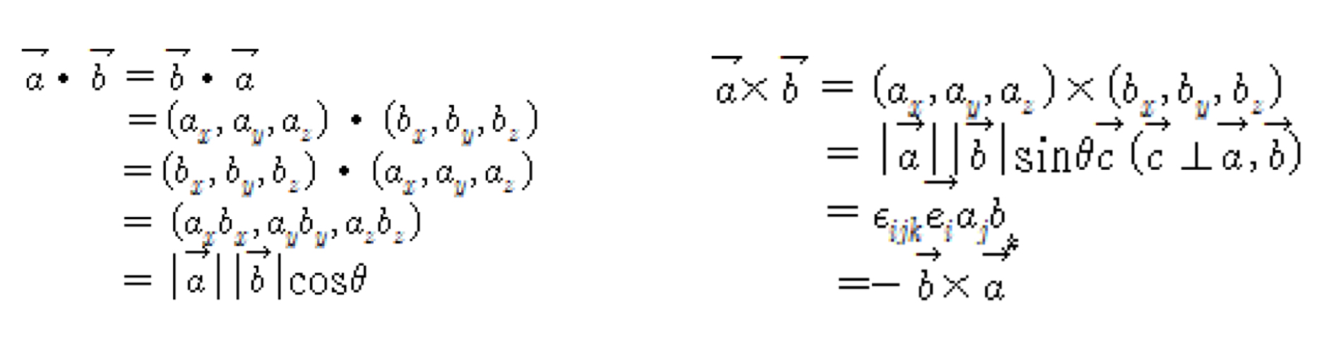 - 내적은 교환법칙 성립, 외적은 교환법칙 성립하지 않음, 내적은 2차원에서도 정의 가능, 외적은 3차원에서만 정의 가능
