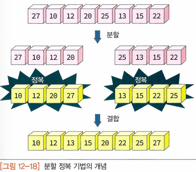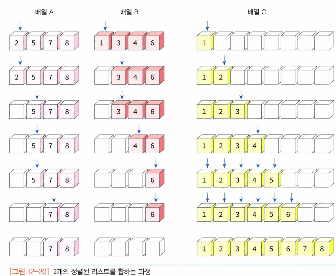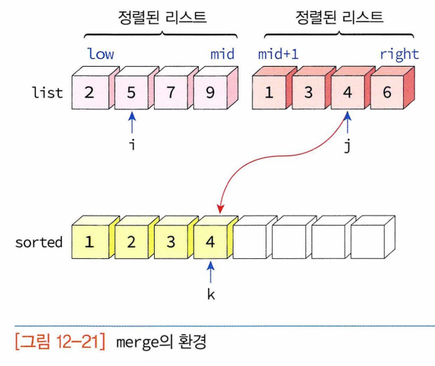 - 합병정렬이 이 알고리즘 이용하게 되고 합병 자체는 어렵지 않으나 추가적인 리스트를 필요로 한다.