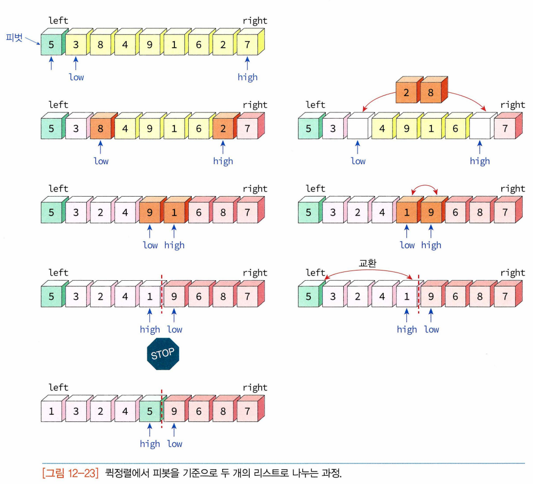 - 퀵 정렬이 피봇을 기준으로 나누어진 왼쪽 부분 리스트와 오른쪽 부분 리스트를 정렬하는 방법 : 합병 정렬과 마찬가지로 퀵 정렬 함수가 다시 부분리스트에 대하여 순환호출 -> 부분리스트에서도 다시 피봇을 정하고 피봇을 기준으로 2개의 부분 리스트로 나누는 과정 되풀이(부분 리스트들이 더 이상 분할이 불가능할때까지)