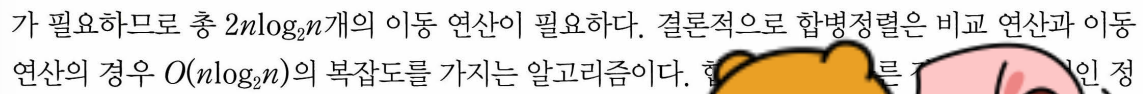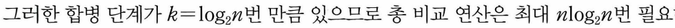 - 각 합병 단계에서 수행되는 비교연산 : 일반적인 경우 하나의 합병단계에는 최대 n번의 비교연산필요.