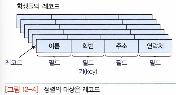 - 정렬시켜야 될 대상: 레코드, 레코드는 필드라는 단위로 나뉘어진다.