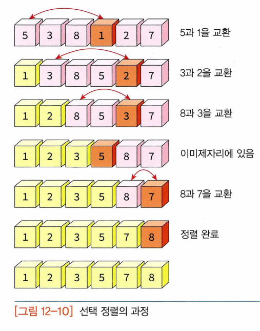 - 선택정렬: 왼쪽 리스트와 오른쪽 리스트가 있다고 가정, 왼쪽 리스트에는 정렬이 완료된 숫자들이 들어가고 오른쪽 리스트에는 정렬되지 않은 숫자들이 들어 있음 , 초기 상태에서 왼쪽 리스트는 비어 있고 정렬되어야 할 숫자들은 모두 오른쪽 리스트에 들어 있음.--> 오른쪽 리스트에서 가장 작은 숫자를 선택하여 왼쪽 리스트로 이동하는 작업 되풀이. 오른쪽 리스트가 공백상태가 될 때까지 이 과정 되풀이.