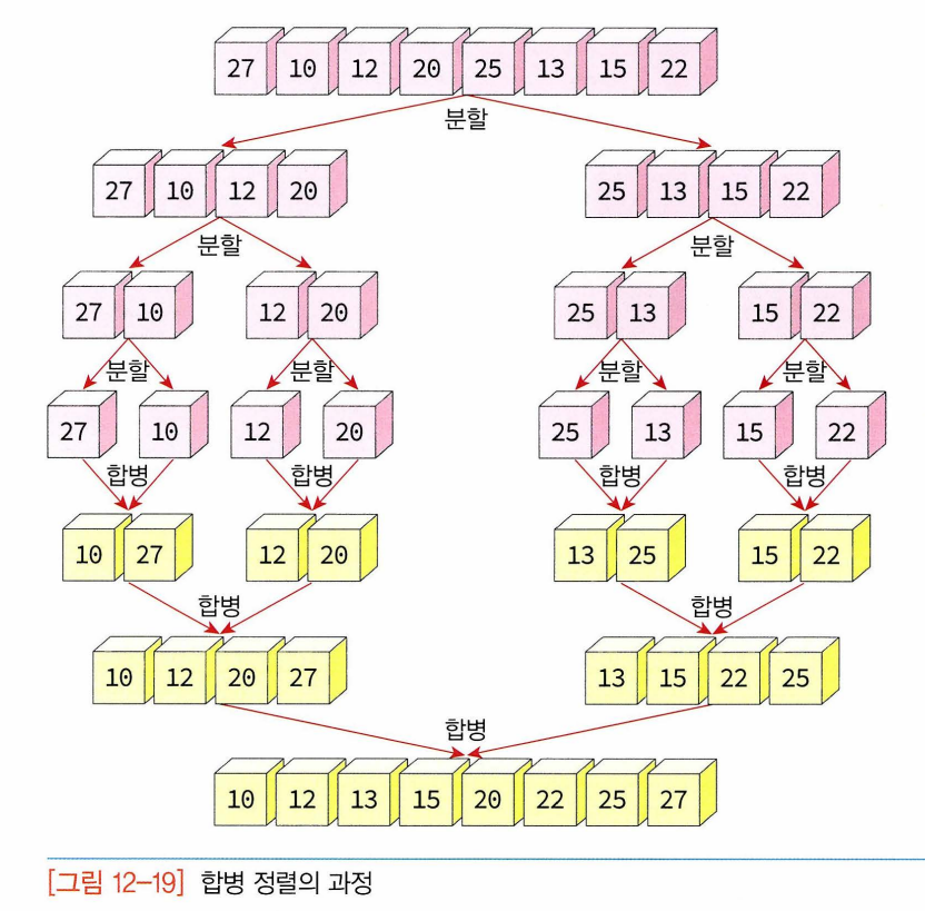 - 합병정렬이 이 알고리즘 이용하게 되고 합병 자체는 어렵지 않으나 추가적인 리스트를 필요로 한다.