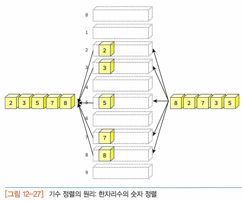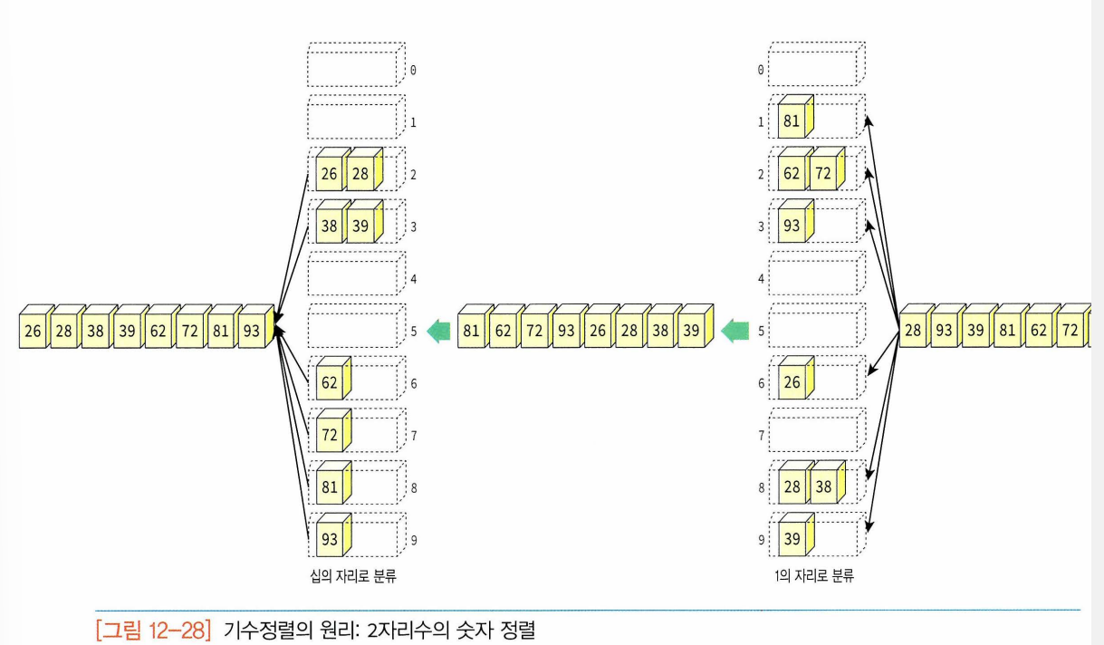 - 기수정렬(radix sort) : 레코드를 비교하지 않고도 정렬하는 방법. 입력 데이터에 대해 어떤 비교 연산도 실행하지 않고 데이터를 정렬할 수 있는 색다른 정렬 기법. 다단계 정렬, 단계의 수는 데이터의 자리수의 개수와 일치.