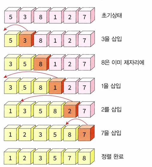 - 정렬되어 있지 않은 부분의 첫 번째 숫자가 정렬된 부분의 어느 위치에 삽입되어야 하는지 판단 -> 해당 위치에 이 숫자 삽입 -> 정렬된 부분의 크기는 하나 커지고 정렬이 되지 않은 부분의 크기는 하나 줄어듦. -> 삽입 연산을 정렬되지 않은 부분이 빌 때까지 반복 -> 전체 리스트가 정렬됨