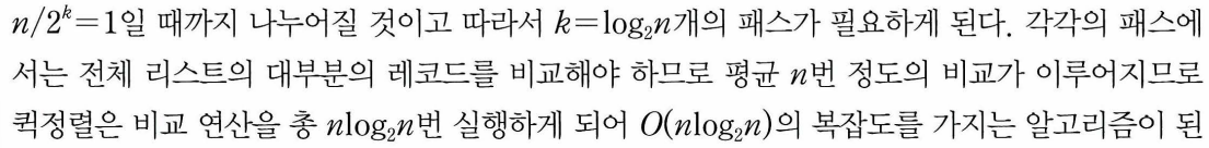 - n이 2의 거듭제곱이라고 가정, 만약 퀵정렬에서의 리스트 분할이 항상 리스트의 가운데에서 이루어짐 -> 합병 정렬의 복잡도 분석처럼 n개의 레코드를 갖는 리스트는 n/2^k의 크기로 나누어짐(크기가 1이 될 때까지)