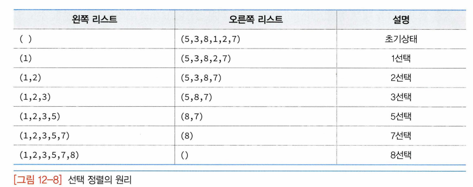 - 선택정렬: 왼쪽 리스트와 오른쪽 리스트가 있다고 가정, 왼쪽 리스트에는 정렬이 완료된 숫자들이 들어가고 오른쪽 리스트에는 정렬되지 않은 숫자들이 들어 있음 , 초기 상태에서 왼쪽 리스트는 비어 있고 정렬되어야 할 숫자들은 모두 오른쪽 리스트에 들어 있음.--> 오른쪽 리스트에서 가장 작은 숫자를 선택하여 왼쪽 리스트로 이동하는 작업 되풀이. 오른쪽 리스트가 공백상태가 될 때까지 이 과정 되풀이.