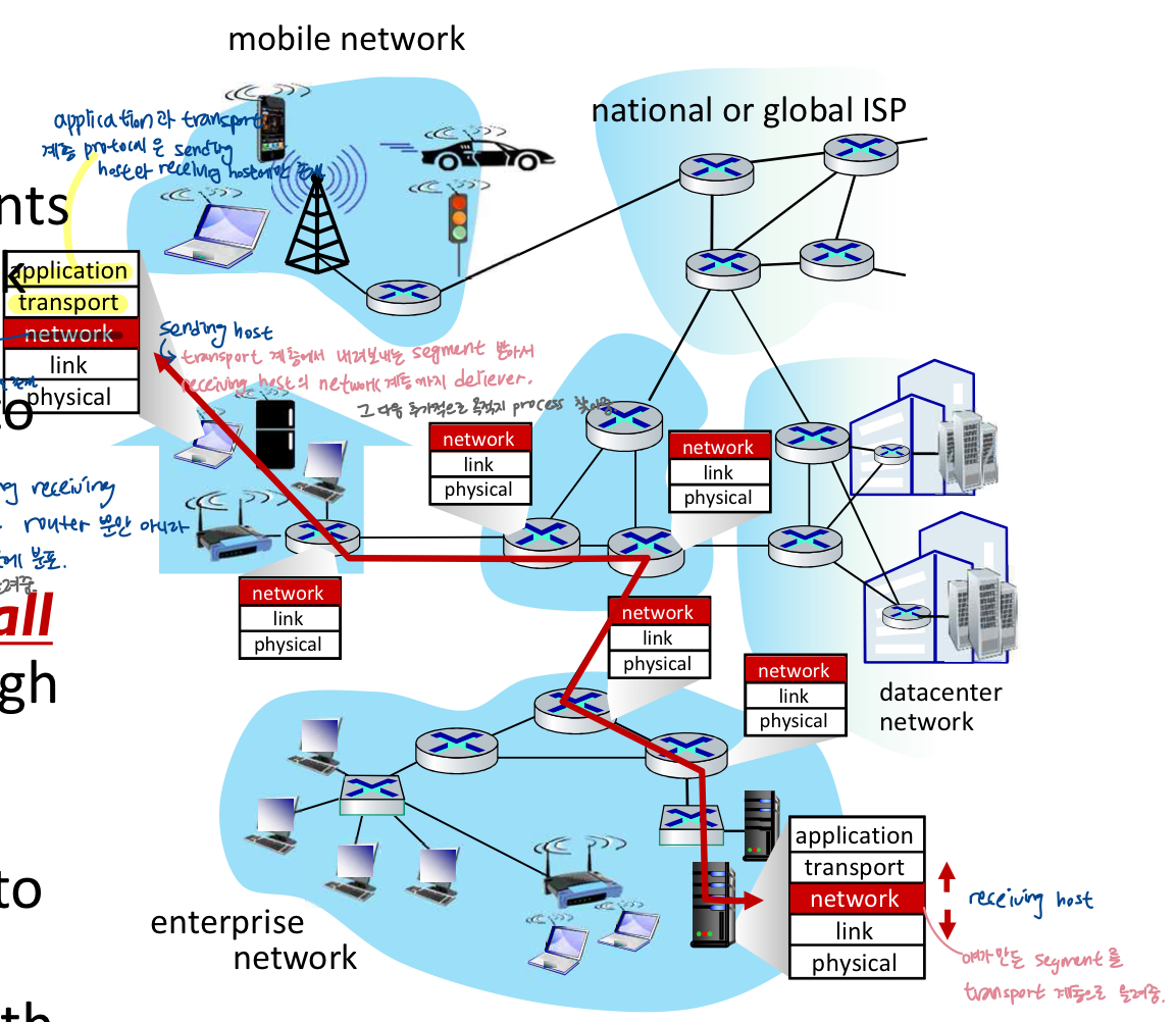 - sending, receiving host는 router뿐만 아니라 여러 곳에 분포 / network 계층 프로토콜은 sending , receiving host뿐 아니라 network core에 있는 router들에도 존재. application과 transprot 계층 프로토콜은 sending host와 receiving host에만 존재.