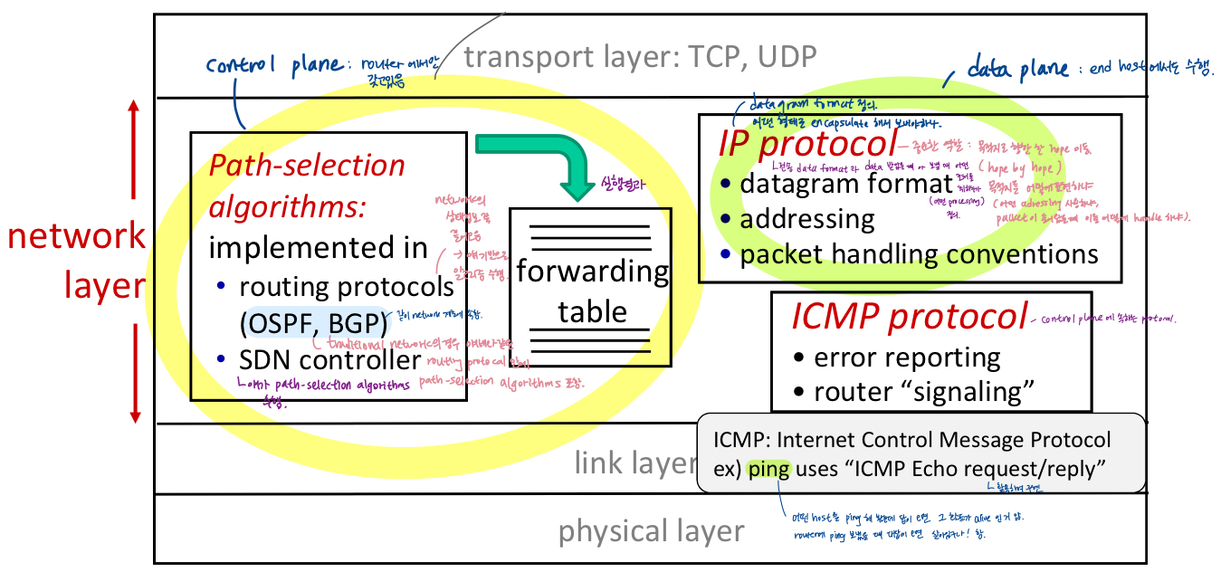 - sender : network 계층에서 transport 계층의 segment를 받아서 이를 network 계층 에서 IP계층 datagram으로 encapsulate(IP계층에 필요한 control을 위한 header 붙이기)해서 protocal stack 타고 내려와서 first of router로 가 link layer를 지난다.