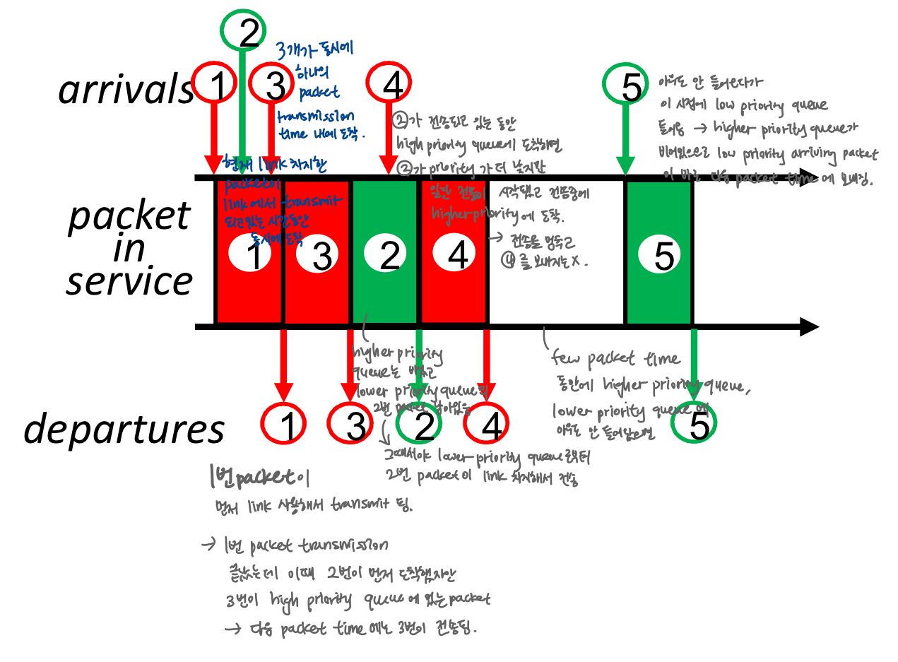 - delay-critical한 application에 대해 더 high priority를 주거나, 지나가는 packet의 header field를 보고 이 packet이 속한 traffic class를 구분한다. class에 따라 priority queue에 집어넣게 되고, link는 priority가 높은 queue가 비어 있지 않는 한 해당 queue에서 계속 링크를 사용할 수 있게 해 준다.