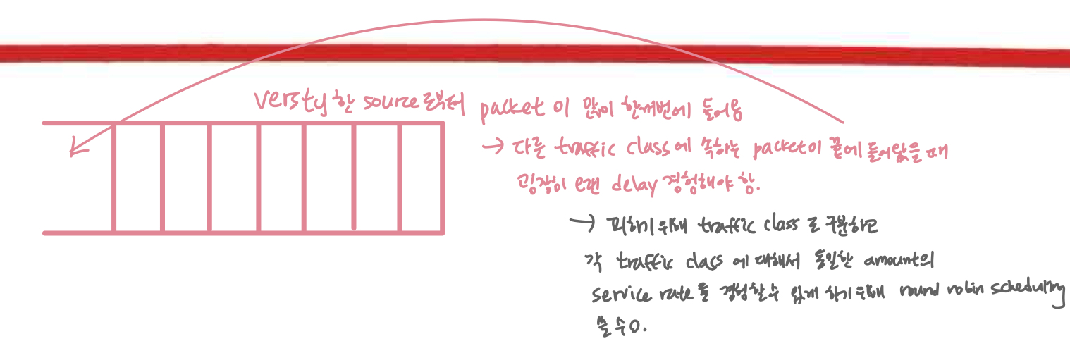 - traffic packets들을 traffic class로 나눠서 다른 queue에 집어넣는 것까지는 똑같음. but queue들은 서비스하는 rate가 다 다 동일하지 x