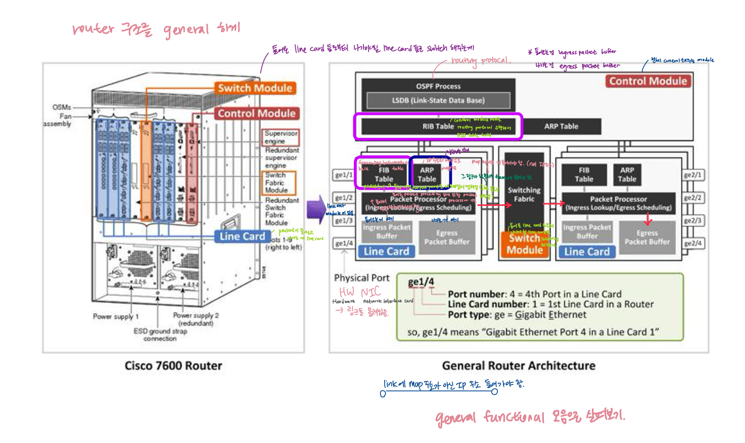 - 일반적인 라우터 architecture에 대한 개략적인 view : 좀 더 추상적으로 그려보면 4가지의 구성요소가 있음.